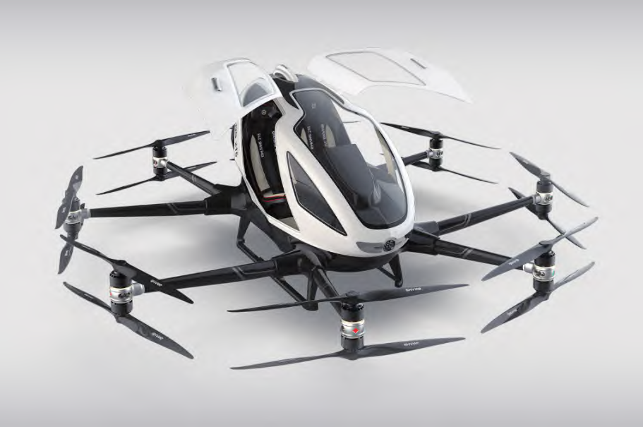亿航 216-S 采用多旋翼构型,通过精确地控制分布式旋翼中每个电机的转速,来实现飞行器的垂直起降、悬停及平移等,基本原理同消费级无人机。该构型的优点是机械结构简单、控制技术成熟、悬停效率高;缺点是有效载荷与航程有限、飞行噪声高、应用场景相对固定。该构型一般可搭载 1 ~ 3 位乘客,最高时速80 ~ 150 km/h,最大航程 20 ~ 50 km,主要应用场景包括机场接驳、低空旅游、短途紧急救援,以及小型作战物资精确投送等军事场合。