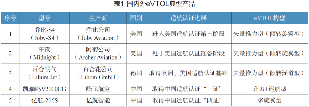 如表1所示,均拥有销售订单且启动了适航认证。以下分别从构型特点、性能特征、技术发展特点等维度,对上述五款 eVTOL 典型产品开展详细跟踪与分析。