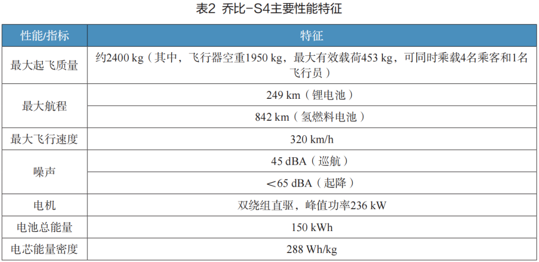 乔比 -S4 属于矢量推力构型中的倾转旋翼型 eVTOL,采用可倾转旋翼或推进器,在垂直起降阶段旋翼朝上提供升力,在巡航阶段旋翼倾转至水平方向以提供向前推力,同时由固定翼产生升力。该构型的优点是在设计上没有“死重”(即对当前飞行没有帮助,却必须携带的部件重量)问题,在综合考虑航程、巡航速度和载重比方面优势明显,具有较好的有效载荷、最大起飞重量和运营经济性;缺点是空气动力学问题较多,导致悬停效率低、飞控和机械系统复杂且产生事故风险较高。该构型一般可搭载 2~5 位乘客,最高时速 180 ~ 250 km/h,最大航程 200 ~ 250 km,主要应用场景包括城际快线、物流运输、紧急救援、观光旅游,以及部队投送、战术监视与侦察、后勤补给、医疗保障、忠诚僚机等。