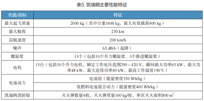 凯瑞鸥采用升力 + 巡航构型,用完全独立的推进器分别实现巡航和垂直起降,没有任何推力矢量,即为垂直起降和水平巡航分别配备了独立的动力系统。该构型的优点是相比于矢量推力型没有复杂的机械倾转机构,设计和飞控系统相对简单,有效提升了巡航效率、航程和安全性;缺点是垂直升力系统在水平巡航阶段属于“死重”,增加了飞行阻力且部分抵消了其效率优势。该构型一般可搭载 2 ~ 5位乘客,最高时速 150 ~ 200km/h,最大航程150 ~ 250km,主要应用场景包括城际快线、物流运输,以及后勤补给、基地安防、长时侦察与监视、通信中继等。