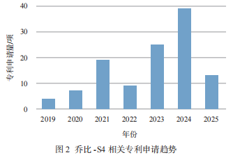 美国乔比公司围绕乔比 -S4 相关技术申请了 116 项专利(截至 2025 年 9 月公开),其中包括 1 项外观设计专利,其余 115 项为发明专利。总体专利申请趋势如图 2 所示,可以看出专利申请量自 2023 年起增长明显,说明乔比公司在该时期加强了乔比 -S4 产品技术创新力度,有力支撑了产品取得重要发展。