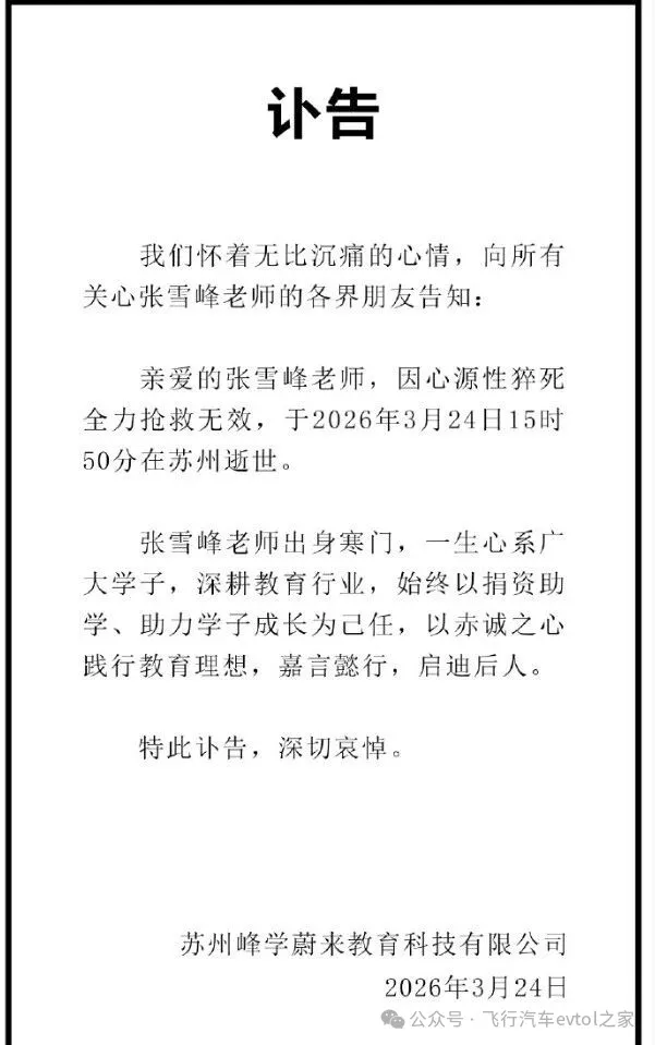 3月24日晚,@张雪峰老师 发布讣告,张雪峰因心源性猝死全力抢救无效,于2026年3月24日15时50分在苏州逝世。